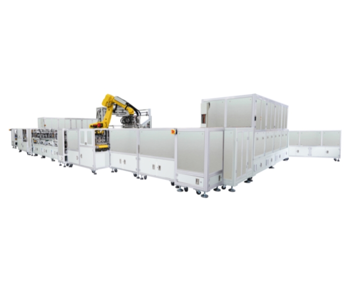 6.机器人码垛:码垛机器人每次抓取6个电芯,放入泡沫托盘,直至托盘摆满;机器人取空托盘放入上一层,可按要求设定堆叠高度;